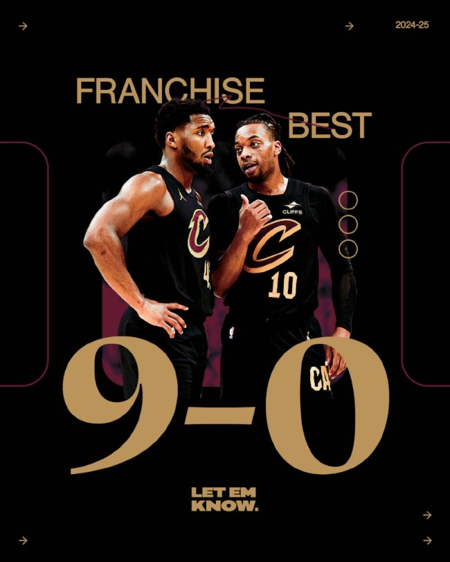 骑士(9-0):米切尔29分4篮板3助攻、阿伦16分14篮板、勒韦尔16分6篮板6助攻、莫布里15分9篮板3助攻3盖帽、加兰14分9助攻、杰罗姆11分5助攻