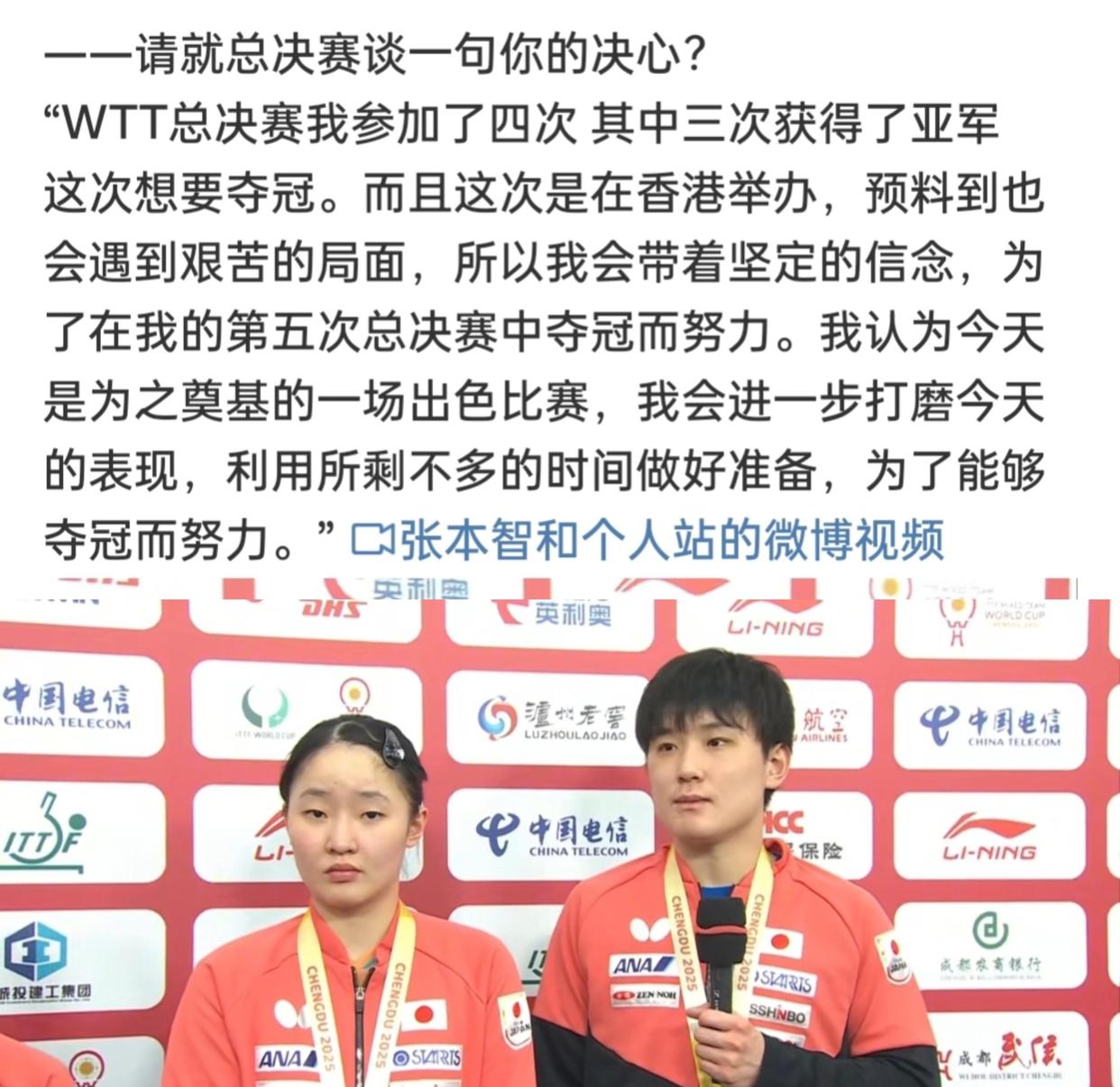 在罗致媒体记者采访时,张本智和再次用“夺金”这个词来概述我方的见识。