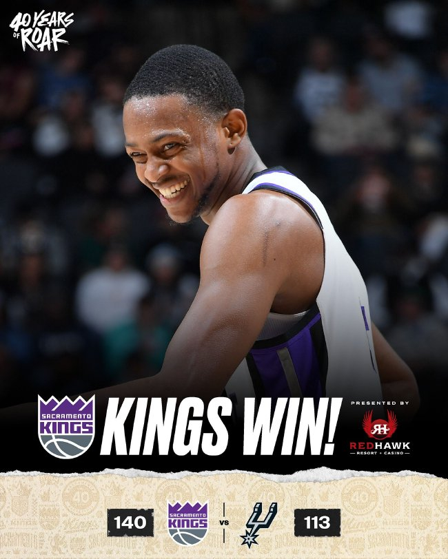 文班亚马连接缺阵,国王4东谈主20+松驰赢得大捷。