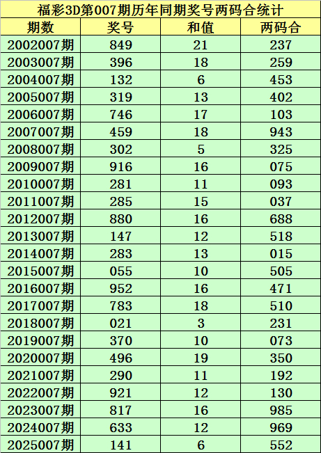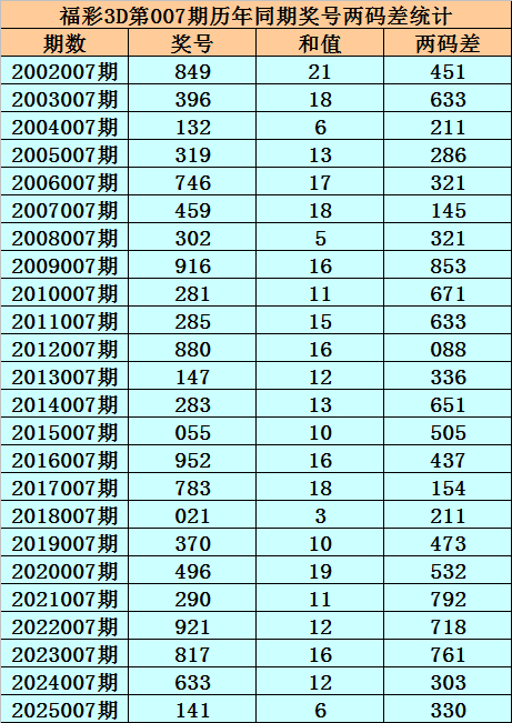 福彩3D第007期,历史上期开出24次奖号,其奖号区别为:849、396、132、319、746、459、302、916、281、285、880、147、283、055、952、783、021、370、496、290、921、817、633、141,奖号两码合差区别开出: