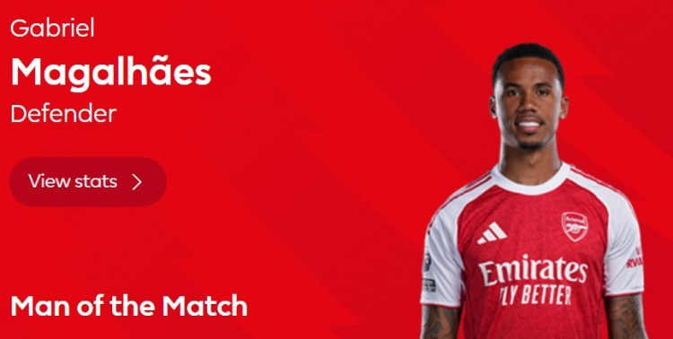 本场比赛加布里埃尔为球队先拔头筹,赛后他也当选英超官方球迷票选全场最好球员。