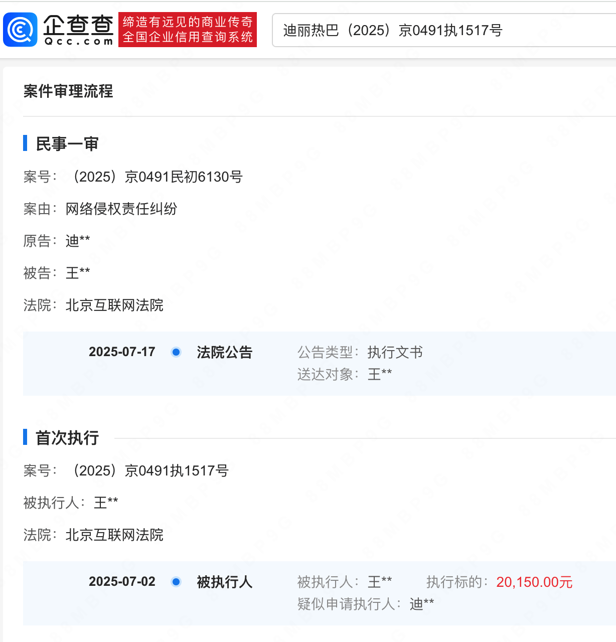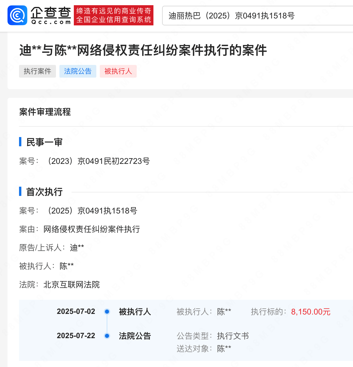 企查查APP露馅,7月22日,因陈某某未致歉,迪丽热巴苦求强制实行,法院刊登判决书。实质露馅,被告通过涉案账号公确立送博文并配图,关联实质组成侮辱、指责,被告辩称其系针对网罗文娱新闻发表批驳。法院判决被告公开赔礼谈歉等,现时被告已被强制实行8150元。
